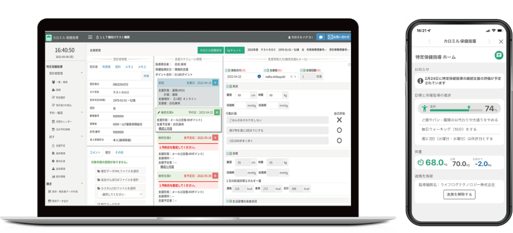 指導対象者の「カロミル」アプリと連携して食事や体重、運動状況などをタイムリーに閲覧